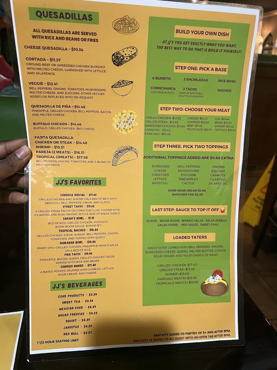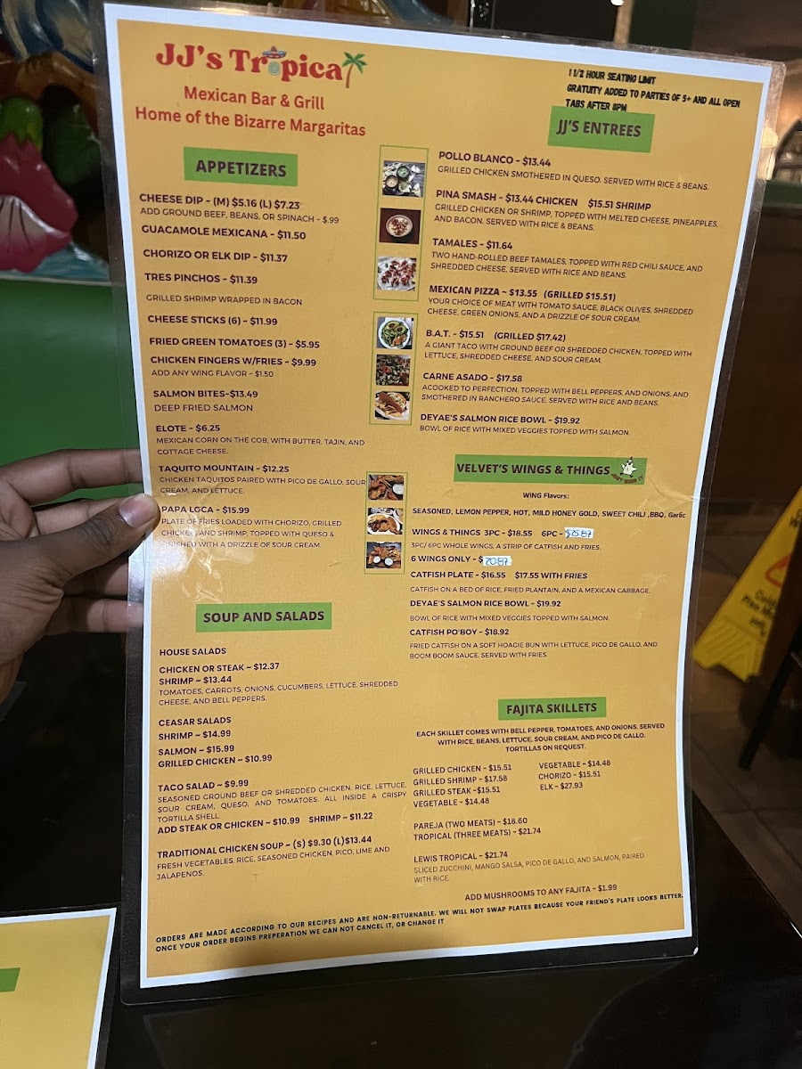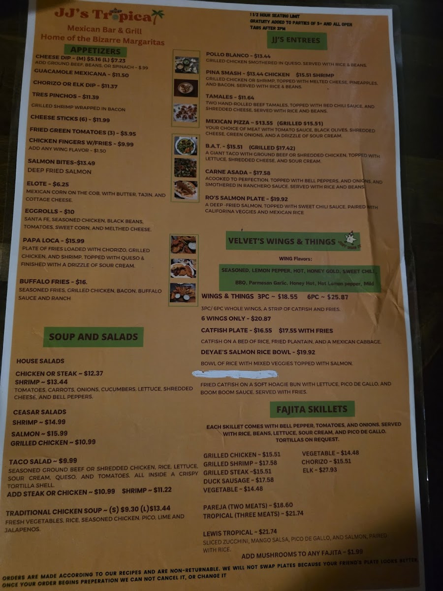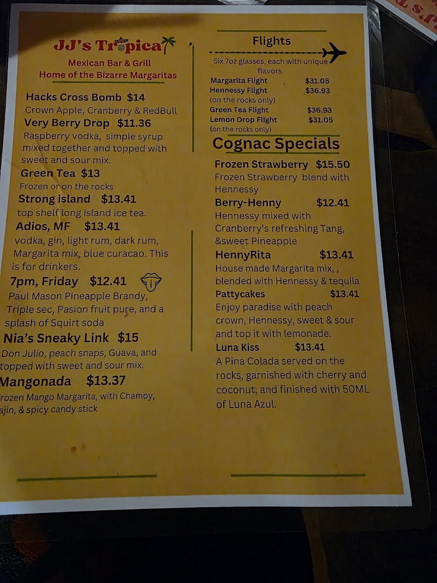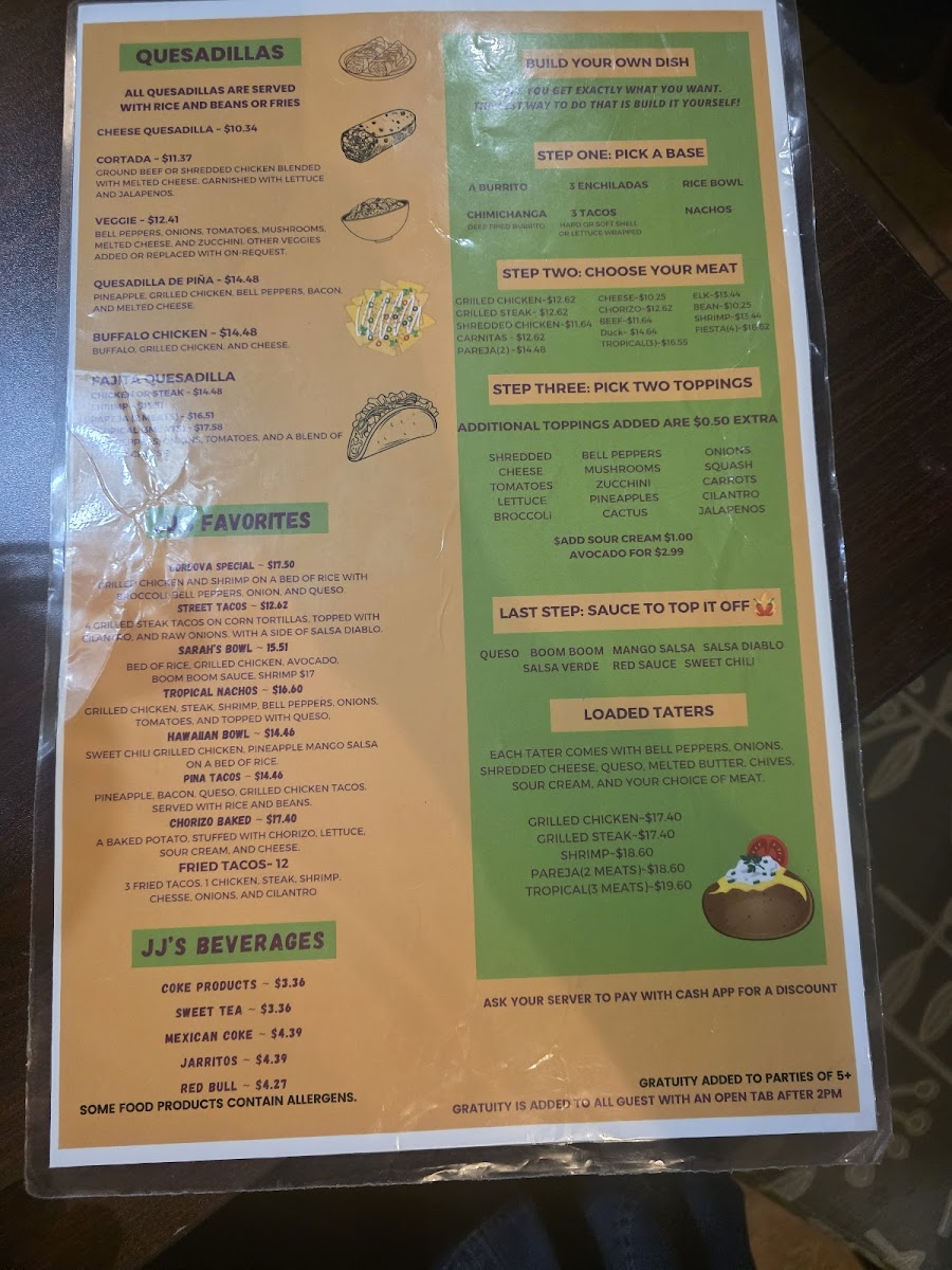 JJ’s Tropical Mexican Bar and Grill offers a menu that balances vibrant Mexican flavors with a relaxed, welcoming vibe. The selection leans toward casual bites and satisfying entrees, crafted to enjoy whether you’re settling in for a laid-back meal or gathering with friends for drinks and small plates.